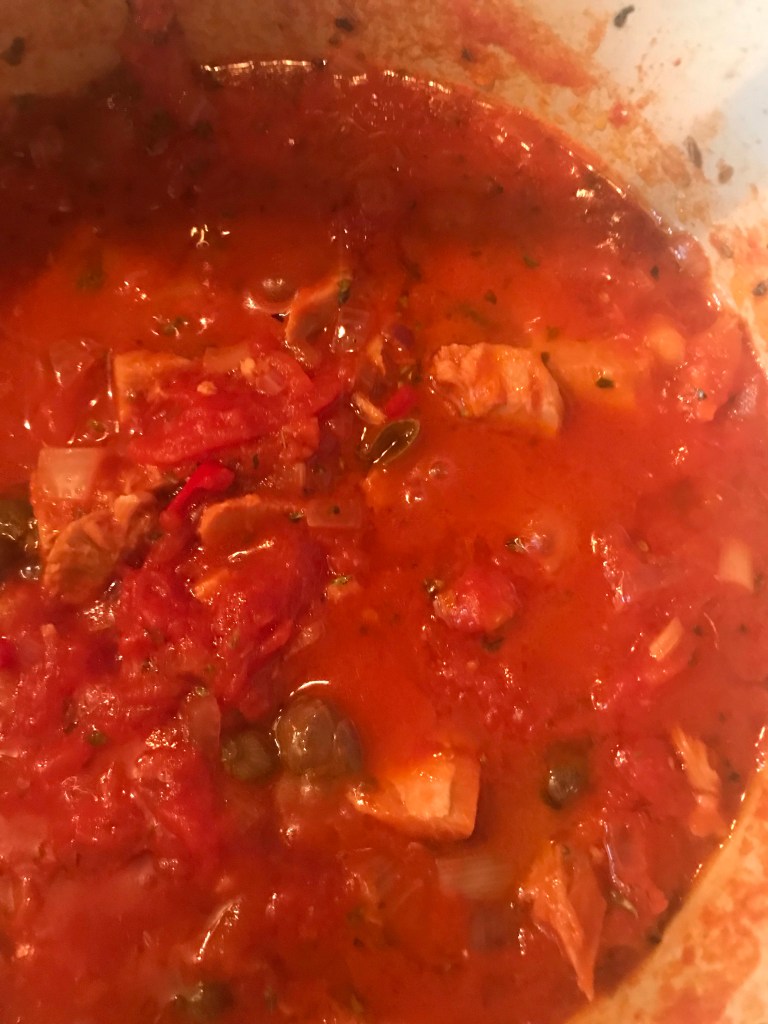 Brown the garlic in the oil, add the anchovies and the pealed tomatoes and cook for 5 minutes, now you can add your tuna. Also add the capers oregano and chili season with salt and pepper.