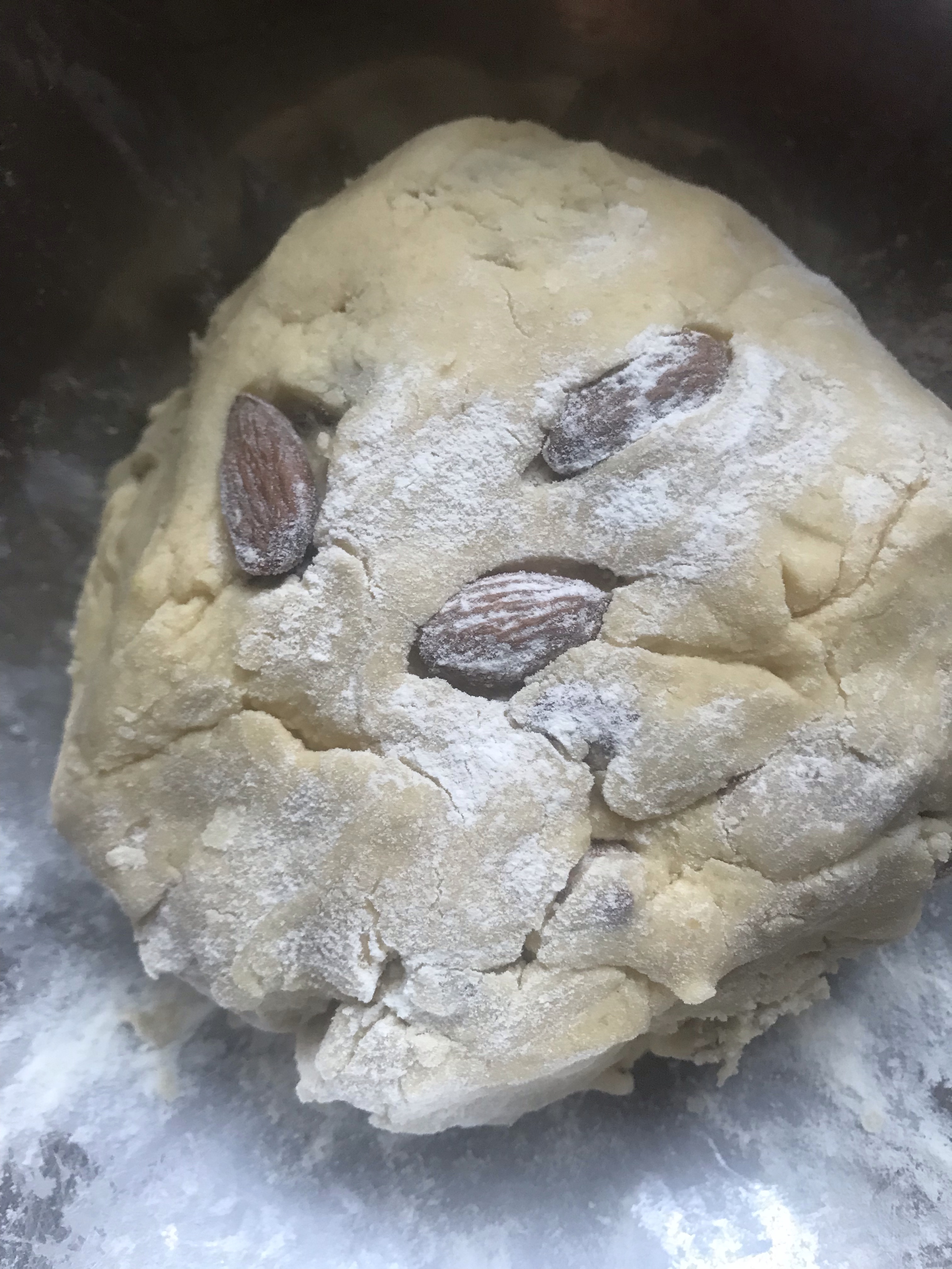 Add the almonds, knead the dough until the almonds are well distributed.