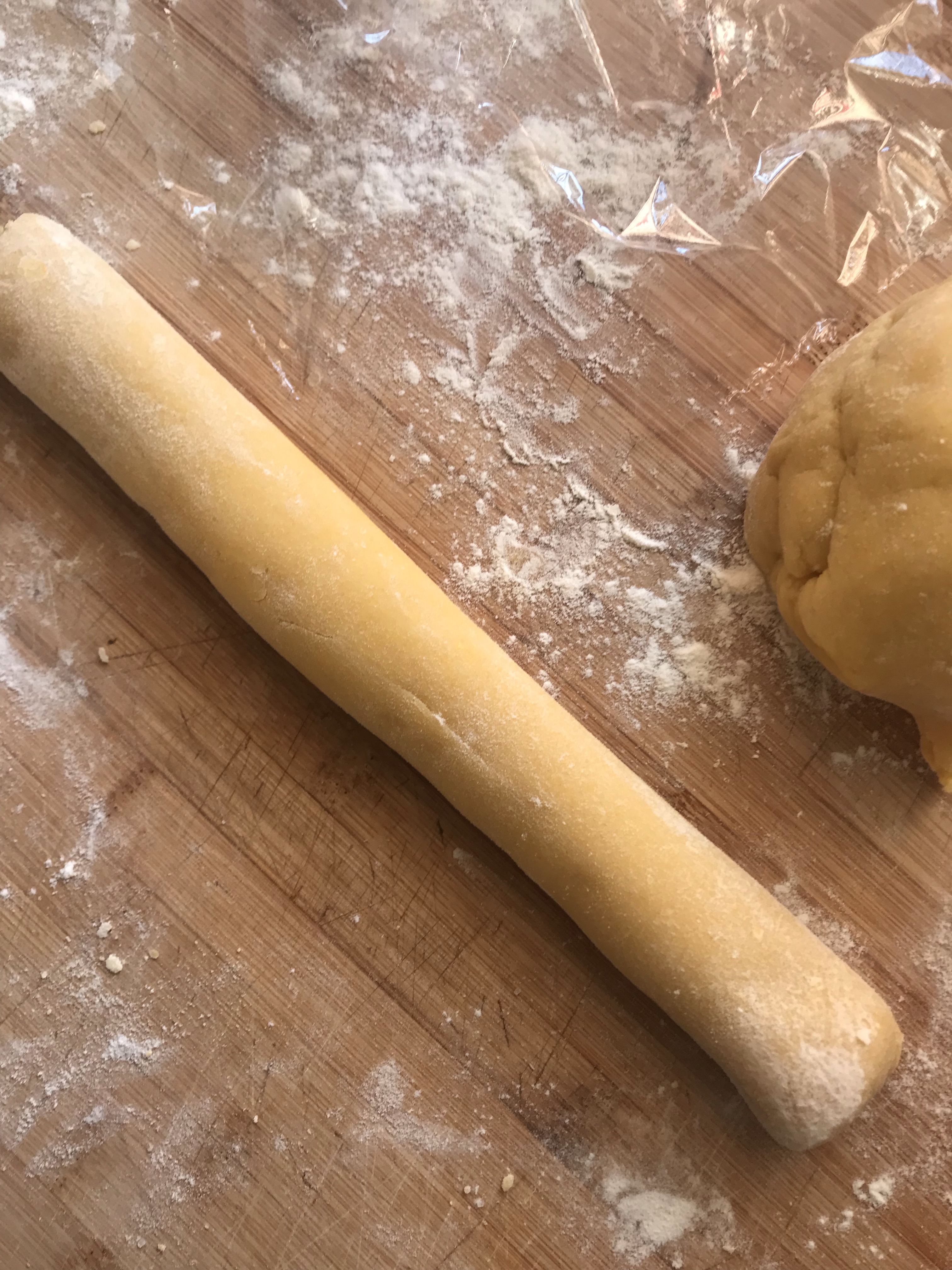 Add the butter in chunks and knead until the mixture is smooth, transfer the dough to a work surface and form a loaf ( more or less 30 cm) cover with plastic film and put in the refrigerator for 30 minutes.
