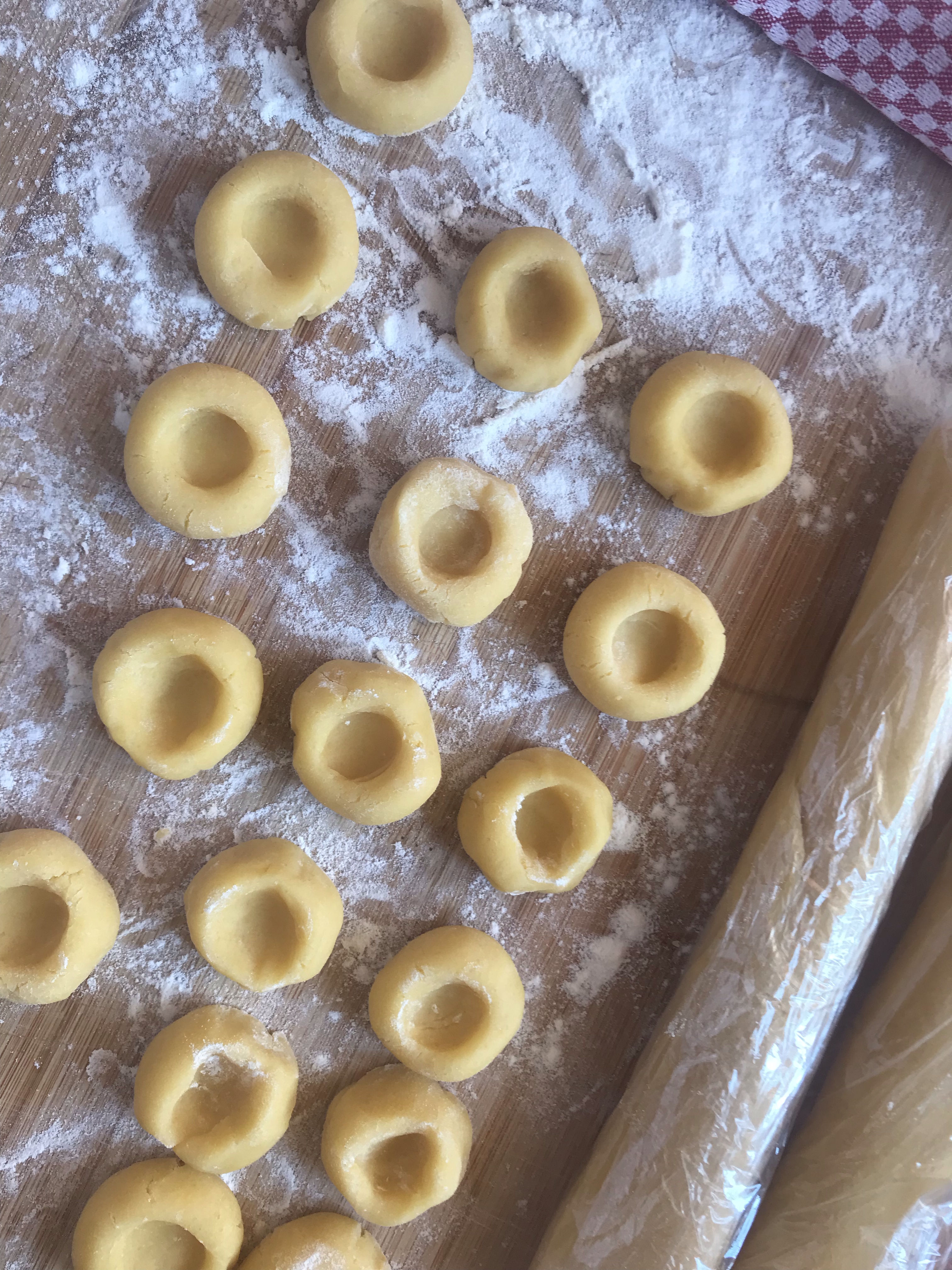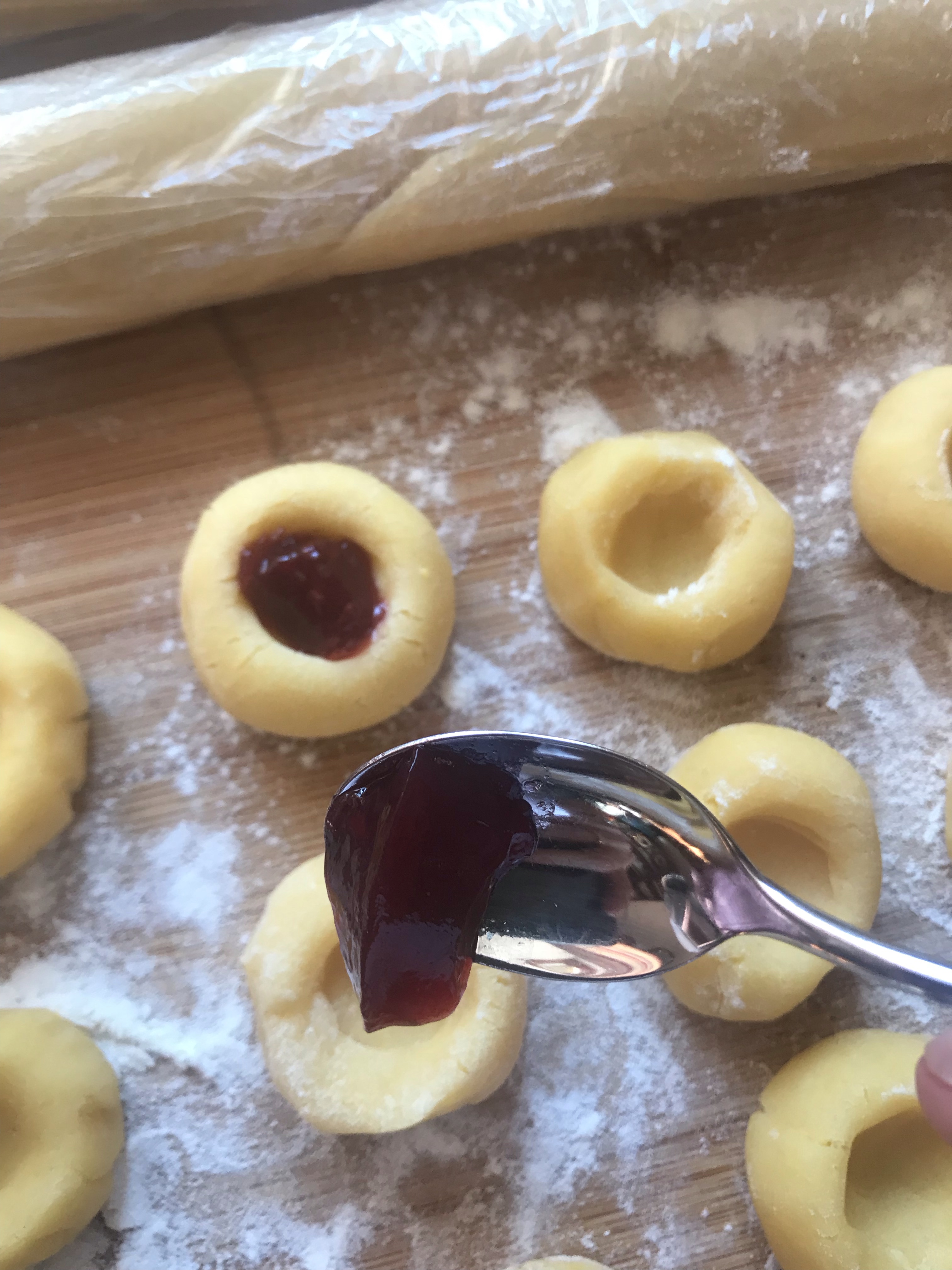 Place them on the dripping pan and press lightly with your thumb to form a little hole and add a teaspoon of jam.