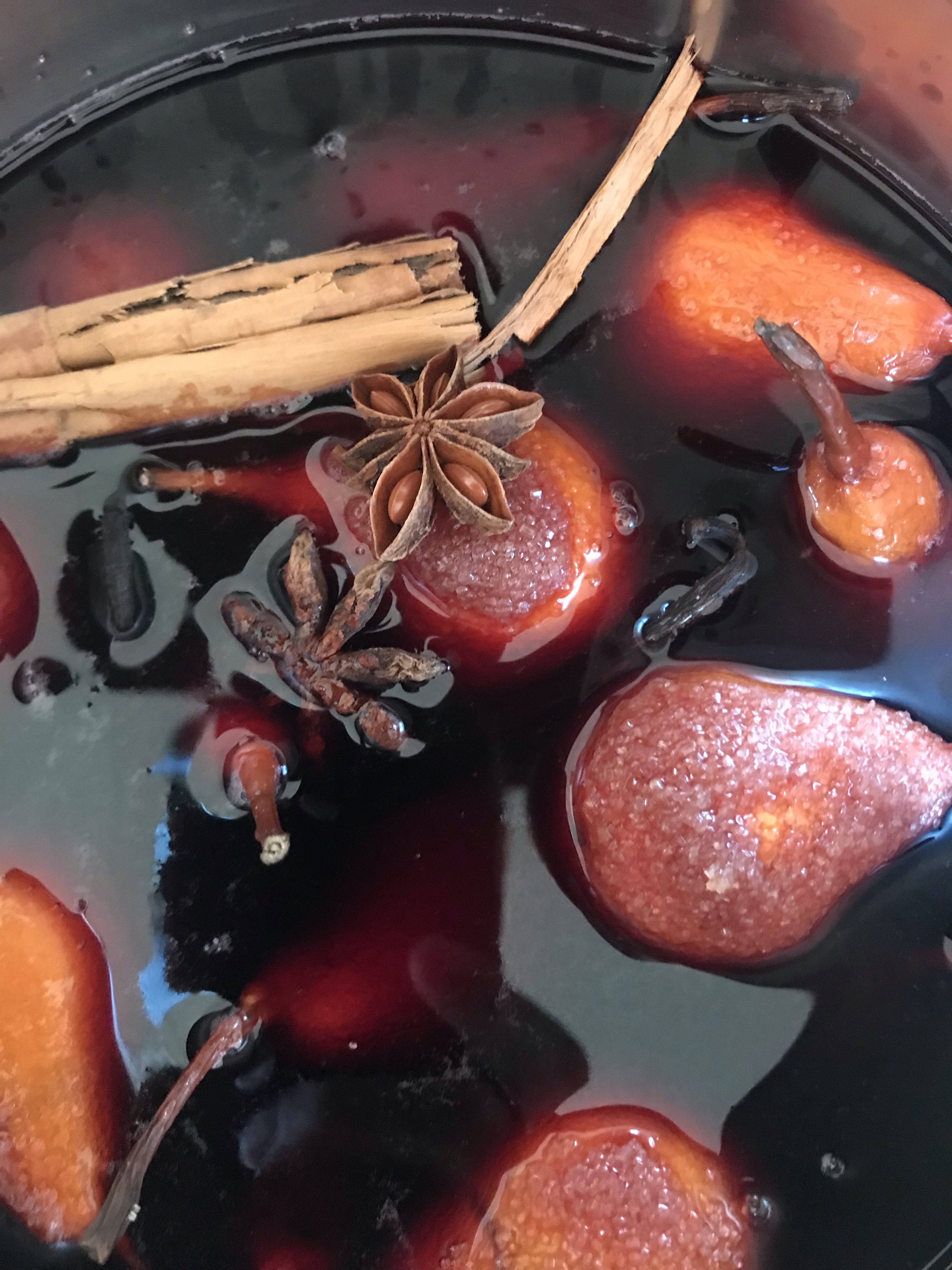 In a saucepan (just large enough to hold the pears) heat the red wine with the granulated sugar, star anise, vanilla pod and a piece of cinnamon and cook them for 40 minutes.
