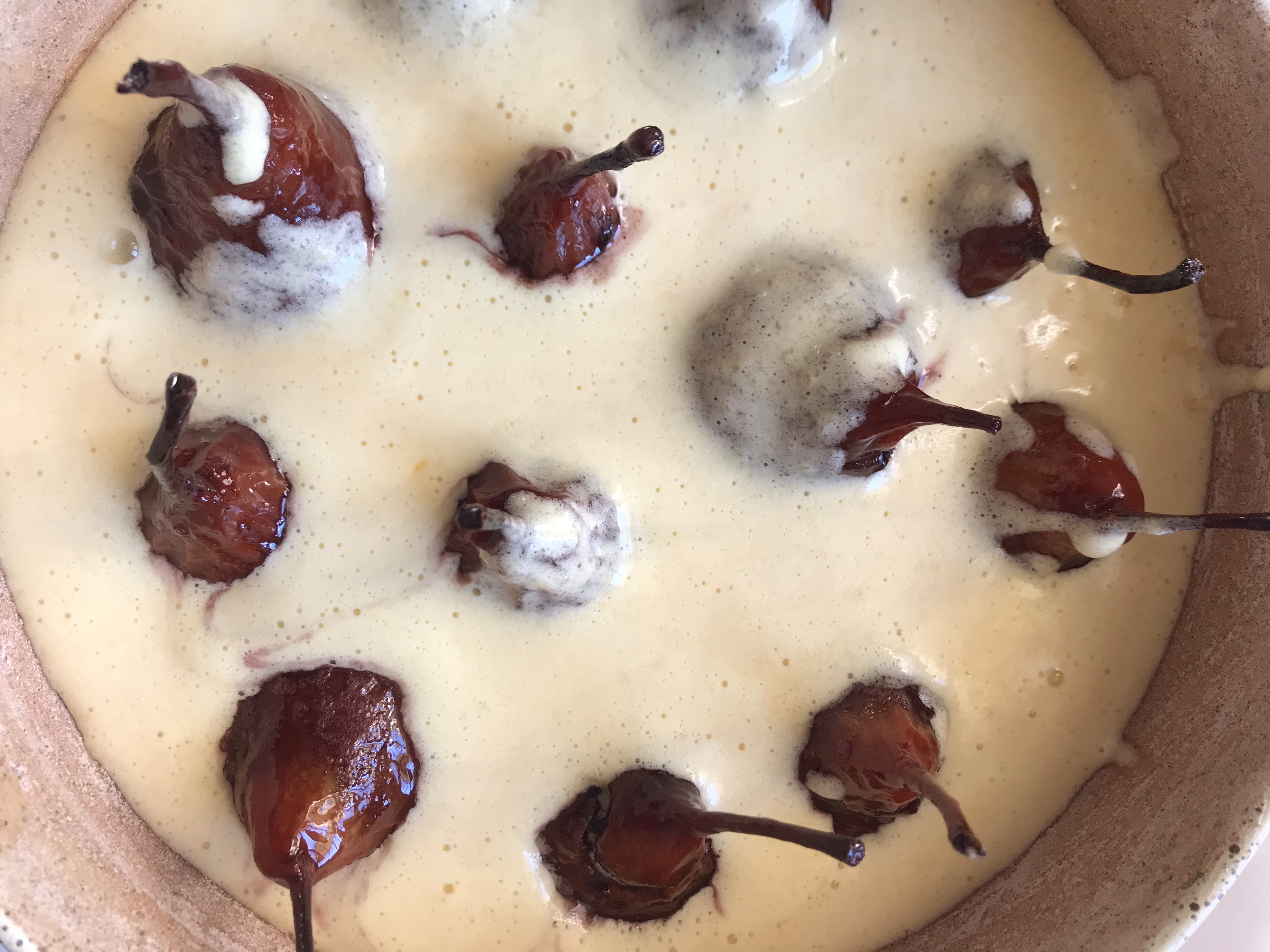 Spread some batter on the bottom of the form, arrange the pears,fill them with some batter. Then add the rest of the batter, letting the pears emerge well.