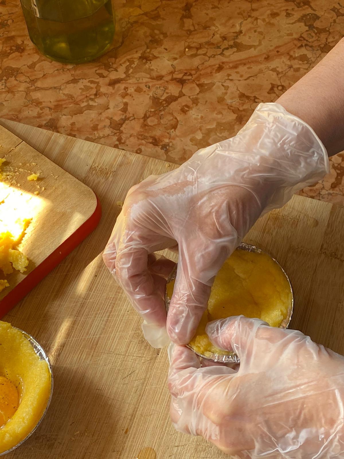 Fill each mold with a bit of polenta, with the help of a spoon or with your hands distribute the polenta well into the mold (on the bottom to the edge of each mold) leaving the middle hollow . In each mold insert the egg yolk add some salt and pepper ( at taste) and cover it up with a layer of polenta (seal them well) add a bit of grated Parmesan cheese on top, bake them in a preheated oven at 180° for 12/ 15 minutes ( you better try one because not every oven is the same )