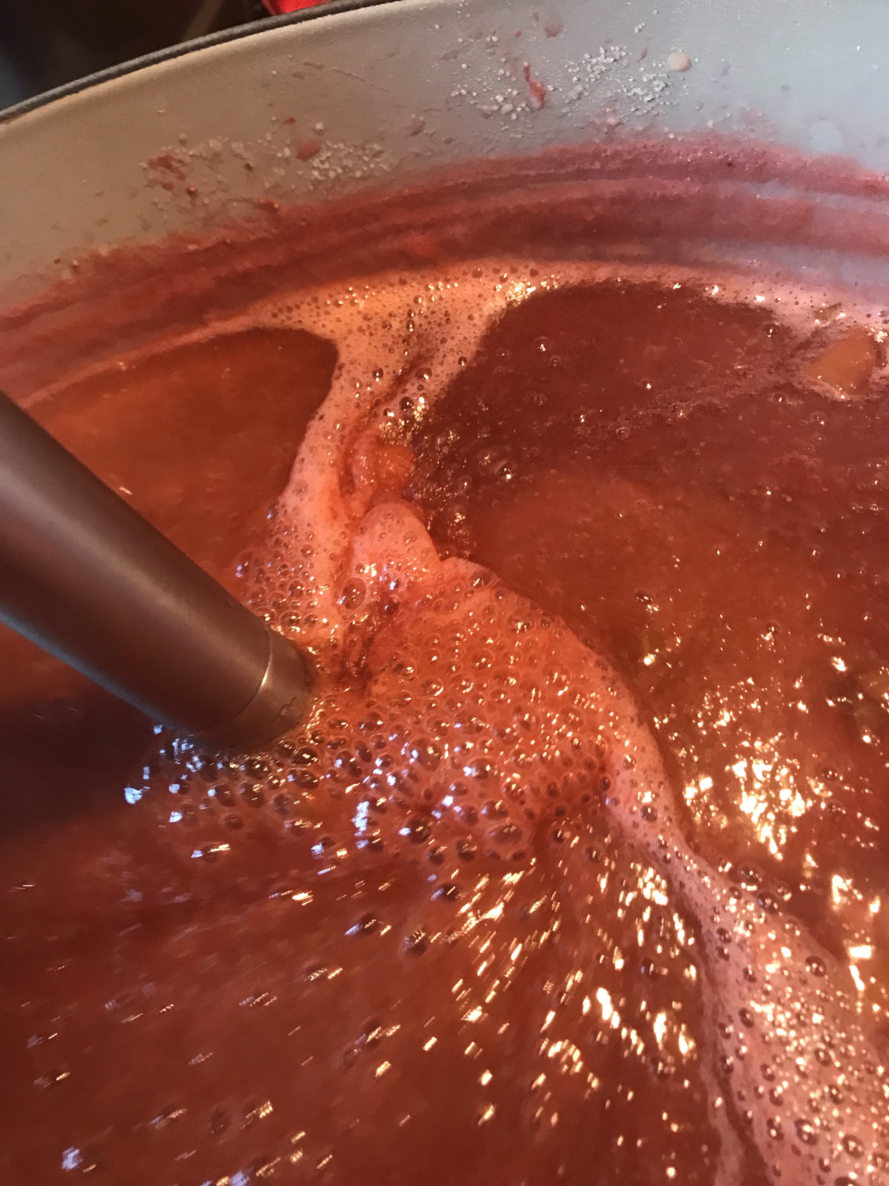 Keep cooking and stirring until the jam thickens, (stirring constantly preventing your jam to burn) you will need to cook the jam for 30 minutes or more. I pass the jam with my immersion blender for a minute .The jam is ready when you put a small spoonful on a cold plate, if the jam thickens on the plate it’s ready.