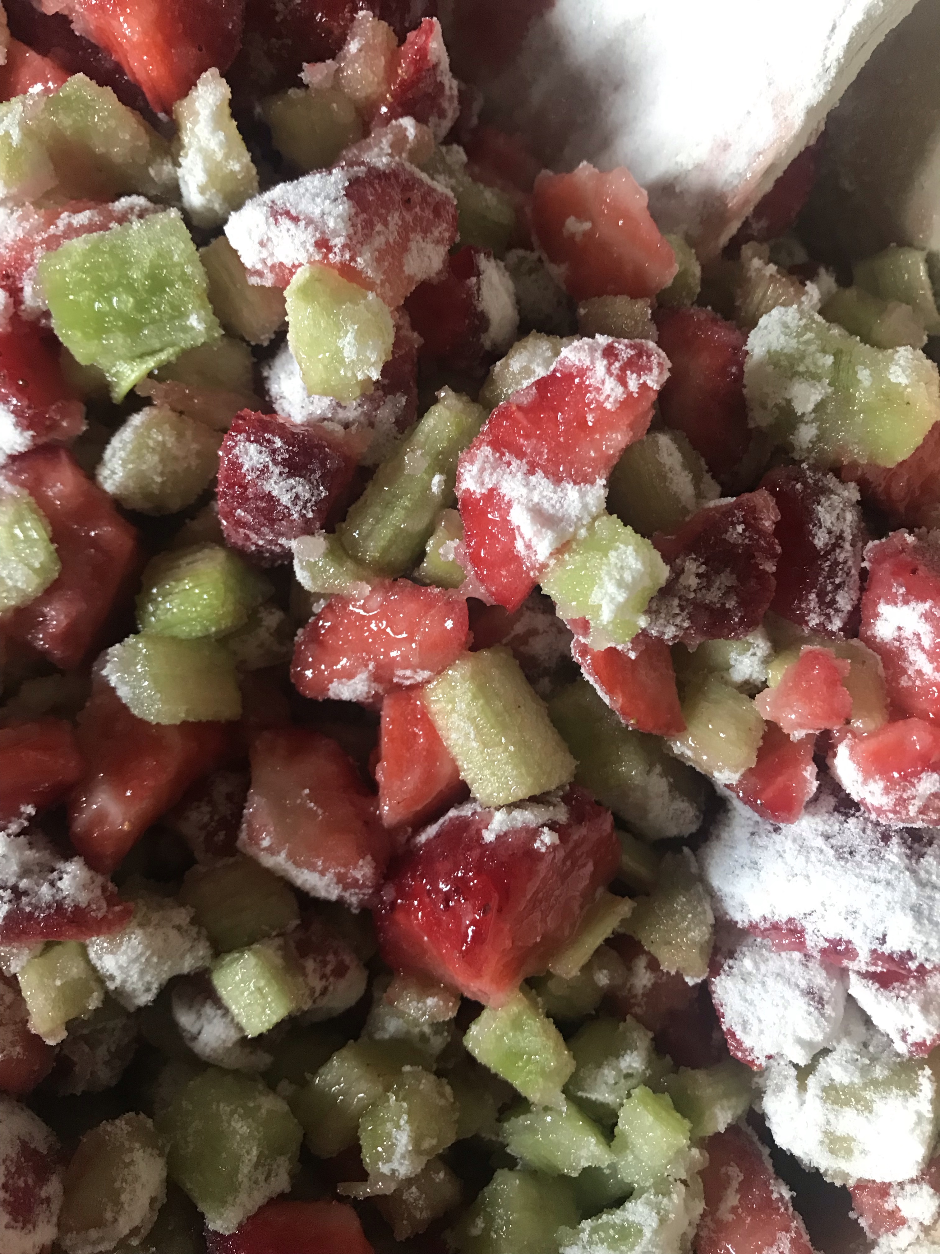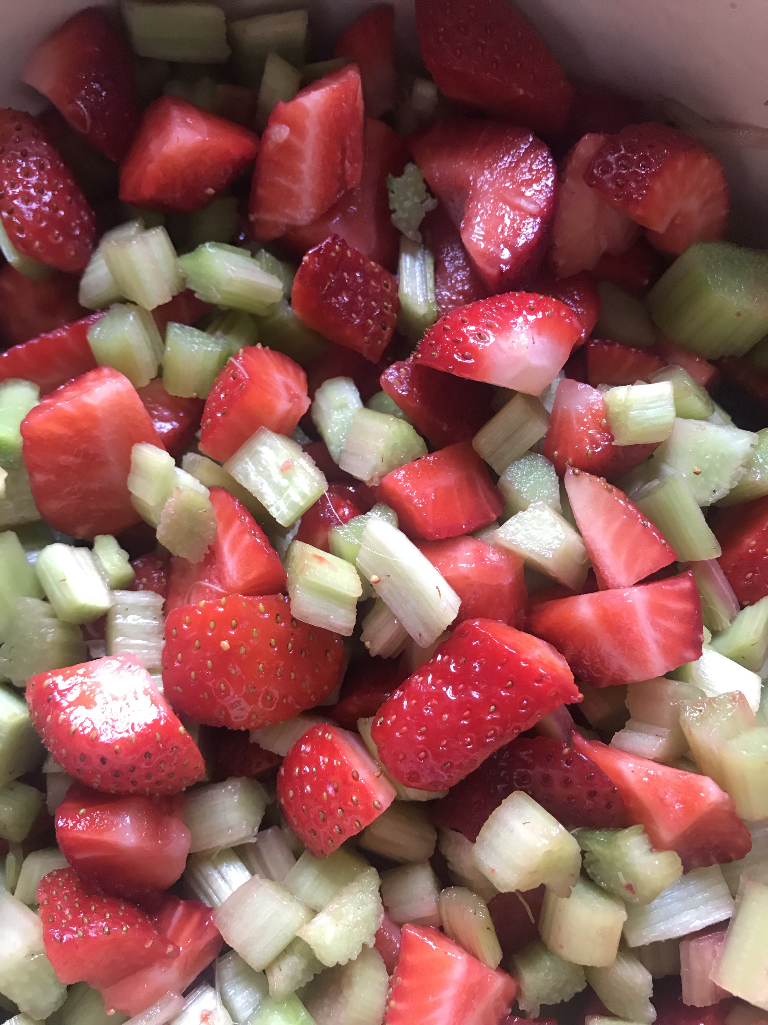 In a bowl combine your chopped strawberries, rhubarb and sugar. Mix well and let it rest for 1 hour. Doing so optimizes the flavor.