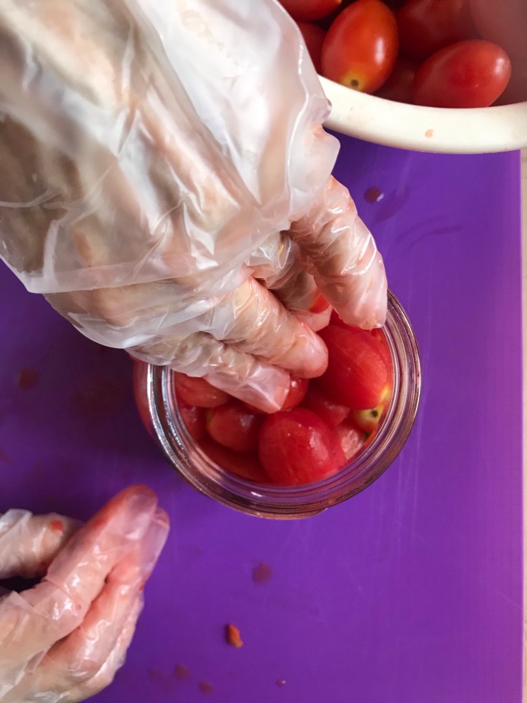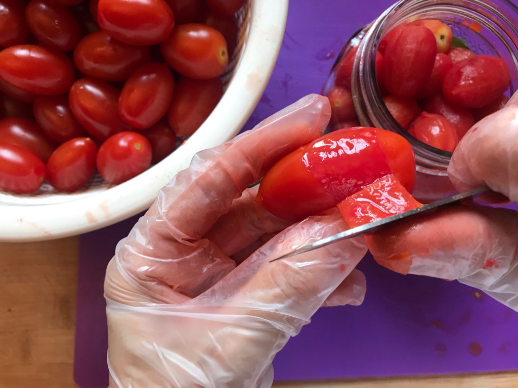 This year we planted 6 little cherry tomato plants in our garden, a first for us but what a treat ! With the real hot summer and a lot of sunshine our pomodori are exquisite and sweet as candy, we stopped counting but we got around 30 kg ! So what a better way to capture the sun on your plate by making “pelati”peeled cherry tomatoes,