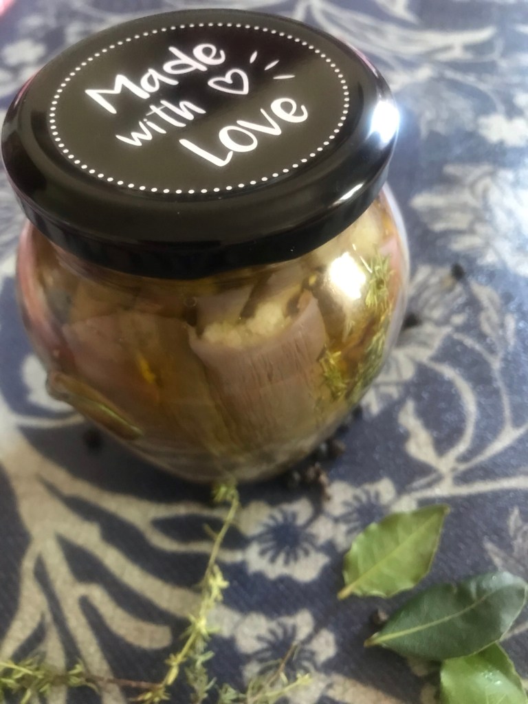 – put them in previously sterilized glass jars, together with the thym; Bay leaves; pepper; garlic.